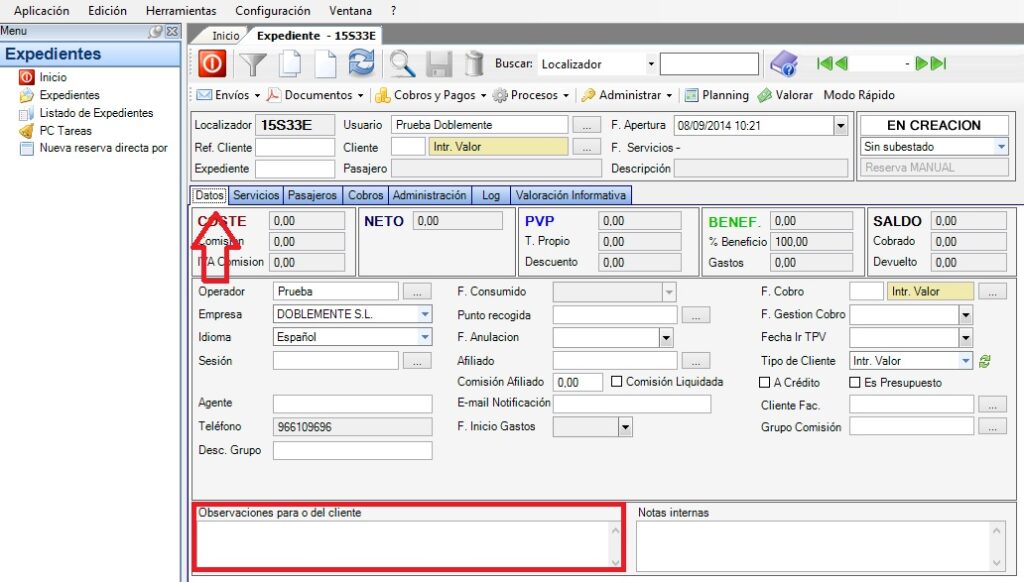 Si deseas introducir observaciones para el cliente en el documento de confirmación de una reserva, tienes habilitado un campo llamado Observaciones para o del cliente en la pestaña Datos del expediente.